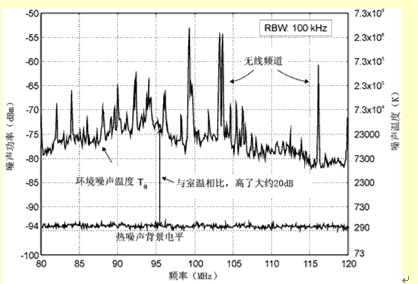 由現場測試可知,在接收FM調頻信號時,ActivvTM有源天線的性能相當於耳機連接線型天線,雖然這兩種天線的尺寸有很大差別。考慮到有源天線的體積小,它的幅射電阻大約隻有1mΩ,而寄生損失電阻至少有1Ω左右,增益在-30~-50dBi的範圍內。對於大多數RF工程師來講,這樣的增益是很難接受的。但是有一個因素極大地放寬了接收FM調頻信號時對增益的要求,即很高的環境噪聲溫度。圖8是一個消聲室(為了得到保守的估計)在屏蔽裝置拿走後的噪聲電平。大多數無線係統工作在頻率高於1GHz的範圍,環境噪聲接近室溫,增益為-10dBi,相當於信噪比降低了10dB,在FM頻段內,在城市的大部分地區,由於人為噪聲的影響,噪聲電平高了大約20dB(對於調幅會更高)。因此,與完美的雙極電線相比,效率差的天線收到的信號較弱,噪聲較小。圖9給出了增益不同(0、-20、-40dB)的三種天線不同噪聲溫度時的G/T值。所有三種天線都接到噪聲指數為6dB的接收器上。對於增益為-40dB的實際天線(在室溫下G/T值減少46dB),當情況相同時,在23.000K的典型溫度下性能提高了19dB。對於有源天線,通過壓製接收器的噪聲指數,可以把性能再提高6dB。所以,從信噪比方麵看,增益為 -40dB的無源天線,隻比完美的雙極天線差27dB。