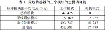 無線傳感器的三個主要消耗電能的模塊是:感應模塊、無線通信模塊和微控製器模塊,如表1所示。這三個模塊主要有兩個操作模式:關機模式和工作模式。在這兩種模式下分析了每種模塊的功耗,以及總的消耗量。