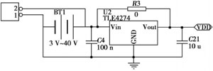 無線傳感器通常的工作電壓範圍為3.0V~3.6V。此次電源設計加入了TLFA274穩壓器(如圖2所示),可轉換3V~40V的電壓,比如通常使用的小型電池或者是汽車電池,給使用者帶來了很大的方便。