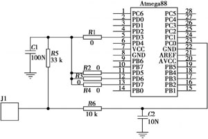 對微控製器芯片選擇Atmel ATmega88,因為它具有低功耗,還有待機模式和主動模式的快速轉換功能,所以無線傳感器能夠在非常短的時間完成數據的測量和傳輸;它有一個內置的掉電檢測電路,可用來提醒用戶傳感器網絡電池是否需要更換;它還有一個內置的A/D轉換器,可以將傳感器的模擬信號轉換成具有10位數字值的數字信號(零代表0V,210-1代表電源電壓和最大可能電壓)。