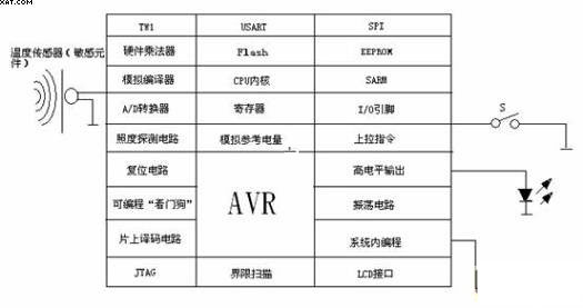 占有傳感器實質上是一種智能式的微控製器,主要有敏感元件、微處理器、信號接收與處理電路、開關及發光LED等部分組成。其中微處理器或稱作微控製器是采用美國Atmel公司生產的低電壓、高性能的AVR 8-bit RISC微控製器,又稱作Atmega88。此微控製器屬於片上型微處理器,以CIP-51為內核,它本身集成了許多外圍設備,如A/D和D/A轉換器、1kB 的SRAM、可編程的8kB的 FLASH存儲器、512字節的EEPROM、一個內部RC振蕩器等。所有的I/O端口的每一個引腳都置上拉電阻,根據要求可獨立地通與斷。片上定時器/計數器具有定時、捕獲、比較和PWM輸出等功能。Atmega88結構框圖如圖1所示。