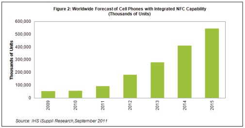 據IHS iSuppli公司的移動與無線通信研究報告,由於市場對移動電子支付和其它應用的需求旺盛,2015年采用近距離通信(NFC)技術的手機出貨量將是是2010年5620萬部的10倍,達到5.447億部。
