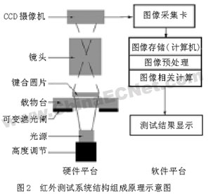 該測試係統的結構組成如圖2所示,由光源調節裝置、光源、可變遮光光闌、測試台、放大鏡頭、黑白CCD攝像機、數據采集卡和計算機組成。