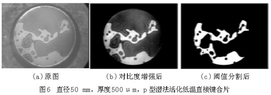 圖6(a)和圖7(a)中,圓形區域是要鍵合的圓片,其中明區為鍵合上的地方,暗區為未鍵合上的地方,圓形區域(即鍵合圓片)以外為圖像背景。從圖上可以大致地看出空洞(未鍵合區域)的分布、個數和大小等。為了獲得更為準確的數據信息,借助圖像處理程序對圖片(a)進行對比度增強、平滑、分割等一係列處理,可獲得圖(b),(c),從而得到鍵合率。樣品1的鍵合率為28.12%,鍵合率很低,並且從圖6中空洞的分布可以看出,樣品1鍵合得很不好。樣品2的鍵合率為66.12%。比較圖6和圖7,樣品2的鍵合質量明顯優於樣品1,keyishuomingjianheyuanpianyuebo,yuerongyijianhe。keyicongpingbanlilunlijiezheyijianhexianxiang,yuanpianyuebo,jiemianbiaomiannengkefuyuanpianqiaoqutiehedaoyiqisuoxuyaodeliyuexiao。