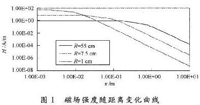 在與發射天線的距離x為常數並簡單地假定發射天線線圈中電流I不變的情況下,如果改變發送天線的半徑R時,就可以根據距離x與天線半徑R之間的關係得到最大的磁場強度H.這意味著:對於每種射頻識別係統的閱讀器作用距離都對應有一個最佳的天線半徑R.如果選擇的天線半徑過大,那麼在與發射天線的距離x=0處,磁場強度是很小的;相反,如果天線半徑的選擇太小,那麼其磁場強度則以z的三次方的比例衰減,如圖2所示。