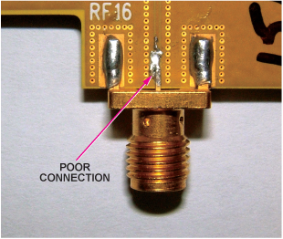 其次需要考慮PCB的裝配連接器與PCB傳(chuan)輸(shu)線(xian)路(lu)之(zhi)間(jian)的(de)結(jie)點(dian)至(zhi)關(guan)重(zhong)要(yao),因(yin)此(ci)連(lian)接(jie)器(qi)的(de)焊(han)接(jie)會(hui)對(dui)過(guo)渡(du)產(chan)生(sheng)重(zhong)大(da)影(ying)響(xiang)。連(lian)接(jie)不(bu)良(liang)或(huo)未(wei)對(dui)齊(qi)的(de)連(lian)接(jie)器(qi)會(hui)破(po)壞(huai)電(dian)感(gan)和(he)電(dian)容(rong)之(zhi)間(jian)的(de)微(wei)妙(miao)平(ping)衡(heng),從(cong)而(er)影(ying)響(xiang)結(jie)點(dian)的(de)阻(zu)抗(kang)。圖(tu)5是一個焊接不良的連接器結點示例。