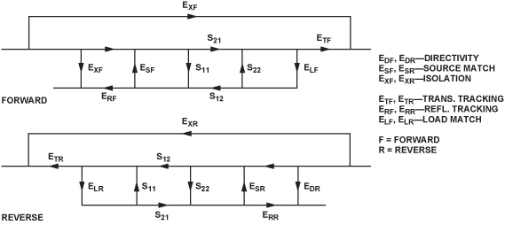 圖4顯示了雙端口係統的完整12項誤差模型及其係統性影響和誤差源。測量頻率範圍會影響校準選擇:頻率越高,則校準誤差越大。隨著更多誤差項變得顯著,必須更換校準技術以適應高頻影響。