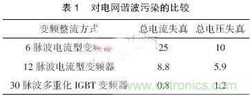 為了將諧波產生的種種幹擾防患於未然,應該在發生源(變頻器)側抵製高次諧波。首先主電路可選擇采用多脈衝數整流、多電平輸出形式,諧波少對電網的汙染也小,如表1 所(suo)列(lie)。從(cong)表(biao)中(zhong)看(kan)出(chu)主(zhu)電(dian)路(lu)整(zheng)流(liu)脈(mai)波(bo)數(shu)多(duo)三(san)電(dian)平(ping)輸(shu)出(chu)可(ke)達(da)到(dao)高(gao)標(biao)準(zhun)的(de)要(yao)求(qiu)。還(hai)可(ke)采(cai)用(yong)動(dong)態(tai)消(xiao)除(chu)諧(xie)波(bo)的(de)方(fang)法(fa),當(dang)然(ran)成(cheng)本(ben)就(jiu)會(hui)增(zeng)加(jia),但(dan)要(yao)比(bi)較(jiao)權(quan)衡(heng)。