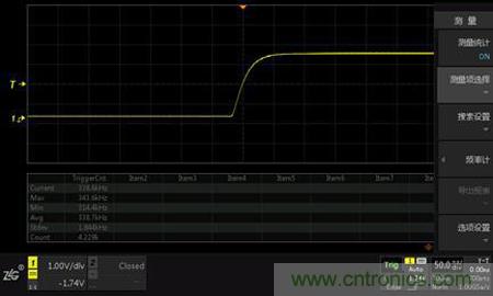 波形刷新率與時基有關,不同型號的示波器測出最大波形刷新率的時基不同。比如測量T公司的DPO2000係列手冊標稱擁有最大5.5kwfms/s的波形刷新率,驗證最大波形刷新率時將時基調為200ns/div。