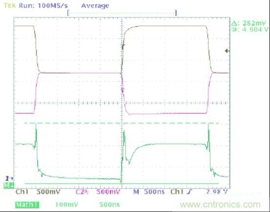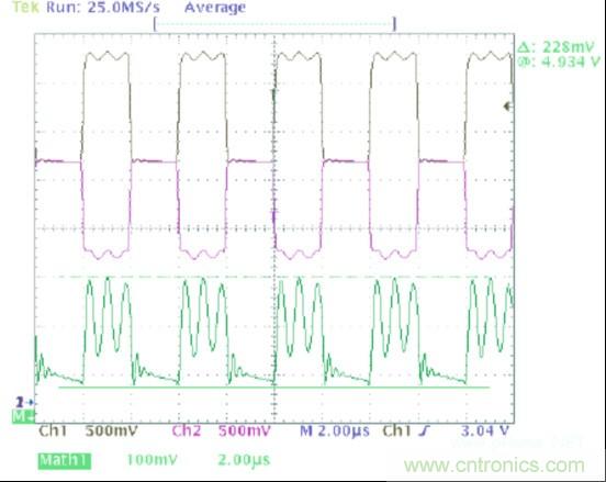 圖1中的波形顯示了一個可以在典型CAN收發器的輸出上觀察到的共模噪聲。在這幅圖像中,黑色軌跡線(通道1)顯示CANH,紫色軌跡線(通道 2)顯示的是CANL,並且綠色軌跡線(數據功能)是CANH與CANL的和。這個求和的過程給出了一個波形,它的值等於此時一個指定點上共模電壓的2 倍。