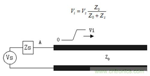 下圖描繪了加在長的傳輸線上的初始波形,初始的電壓Vi傳送到傳輸線上直到到達末端,Vi的幅度通過驅動器電阻和傳輸線阻抗的分壓來決定: