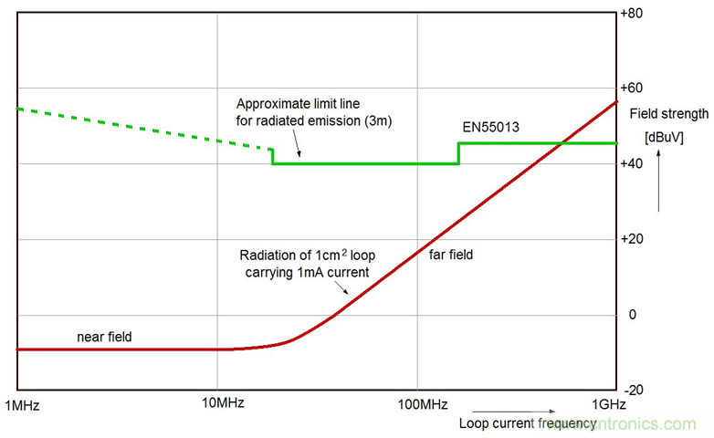 下圖1顯示了一個流過1mA電流的1cm²電流環所形成的輻射強度與電流變化頻率之間的關係,圖中綠線是標準容許的3m距離上的輻射強度閾值。