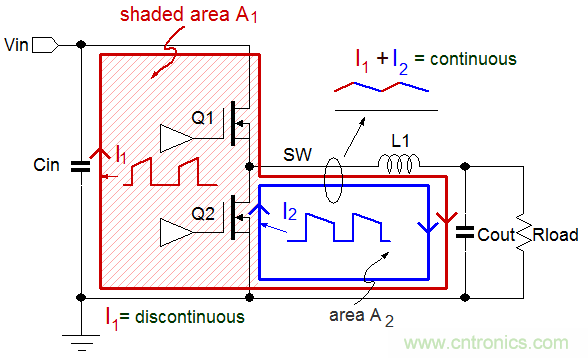 在上麵所述的回路中,電流環I1和I2共同共享了自開關節點→電感→輸出電容→地→Q2的源極這一段路徑。I1和I2合成起來後就形成了一個相對平緩、連續的鋸齒狀波形,由於其中不存在電流變化率dI/dt極高的邊沿,其包含的高頻成分就要少一些。