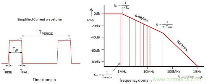 為了理解這能導致多大程度的改進,我們需要對不連續電流脈衝的高頻成分進行一番探討。圖6左側顯示的是簡化為梯形了的電流波形,其周期為TPERIOD,脈衝寬度為TW,脈衝上升/下降時間為TRISE。從頻域來看此信號,其中含有基頻成分和很多高次諧波成分,通過傅裏葉分析可以知道這些高頻成分的幅度和脈衝寬度、上升/下降時間之間的關係,這種關係被表現在圖6的右側。