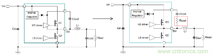 在MOSFET外置的設計中,電阻可被串接到上橋MOSFET的柵極上,這就可以同時增加上橋的導通時間和截止時間。