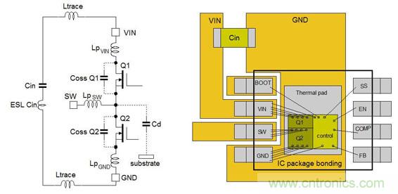 圖8顯示出了一個常規設計中的Buck轉換器IC中的寄生元件。