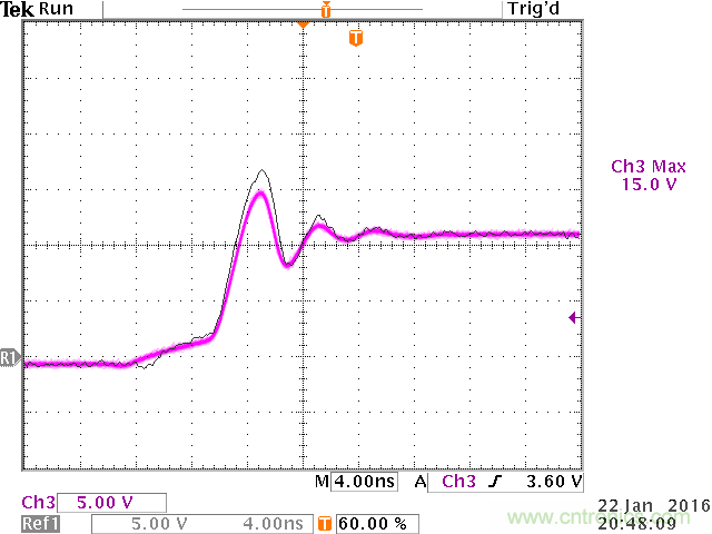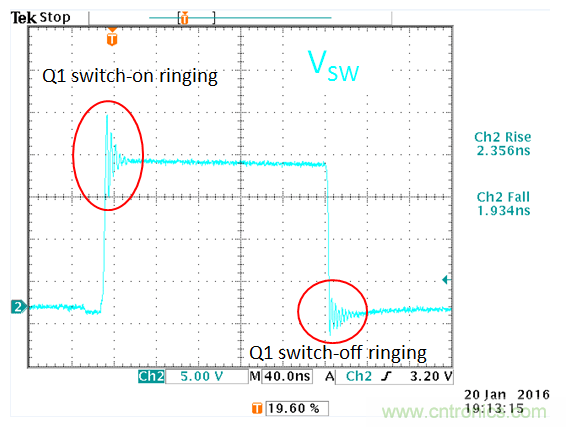 從實驗結果來看,開關切換波形上的過衝實際上已經消失了,但還存在低頻的振鈴信號。
