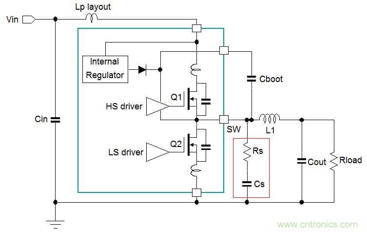 這些寄生電容是由MOSFET的Coss和相對於基底之間的電容共同構成的,另外還有寄生電感存在於從IC引腳到晶圓內核之間的連接線上,這些寄生元件和PCB布局所導致的寄生電感與輸入濾波電容上的ESL一起將導致開關切換波形上的高頻振鈴信號。當MOSFET Q1導通時,開關節點信號上升沿的振鈴信號主要就由Q2的Coss和MOFET開關切換路徑上的總寄生電感(LpVIN + LpGND+ LpLAYOUT + ESLCIN)導致。當MOFET Q1截止時,開關節點信號下降沿的振鈴信號主要由Q1的Coss和下橋MOSFET源極到地之間的寄生電感(LpGND)導致。