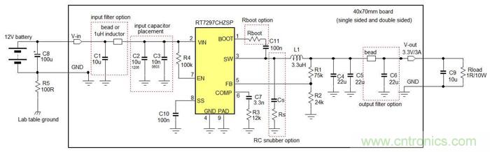 本章將示範在Buck轉換器的EMI設計中的不同方法所導致的影響。示範所使用的IC是RT7297CHZSP,一款800kHz工作頻率、3A輸出能力的電流模式Buck轉換器,采用PSOP-8封裝。測試中的電路工作在12V輸入下,輸出為3.3V/3A,測試所用電路顯示在圖12中。