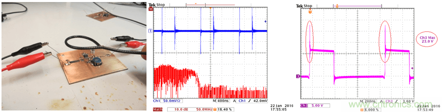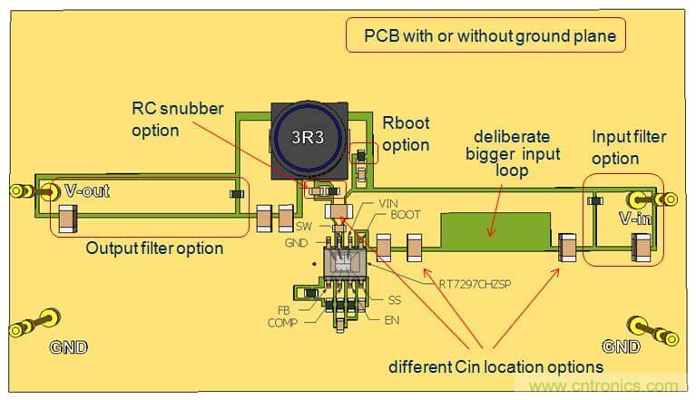 在此實驗中,我們使用雙麵PCB,輸入電容的放置位置如上麵的實驗2一樣,這樣的配置可以在輸入回路中引入比較明顯的輻射。