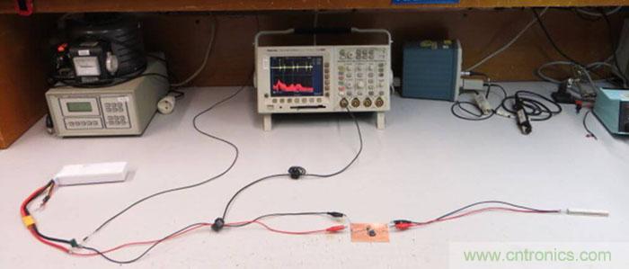 輸入線靠電池一側的接地端通過一隻100Ω的電阻和實驗台的地連接在一起,這就給整個電路提供了一個參考地,其阻抗很像EMC測試中的LISN網絡。