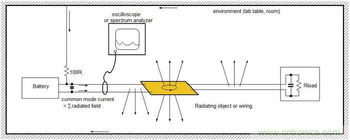 舉例而言,一個1cm²的電流環,其中的電流為1mA,電流變化頻率為100MHz,則距離此電流環3m處的場強為4.4µV/m,或說是12.9dBµV。