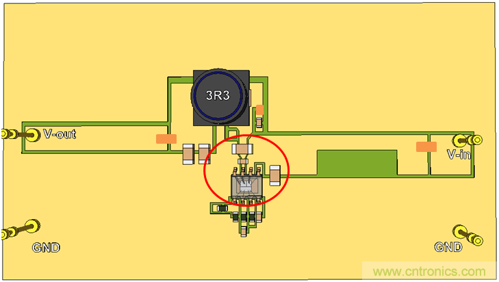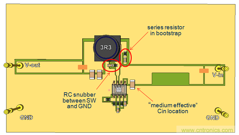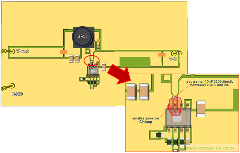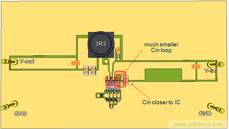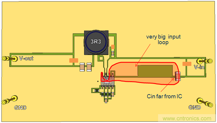我們繼續使用單麵PCB,並將CIN放置到靠近IC的地方,這樣就形成了比較小的CIN回路。參見圖20。