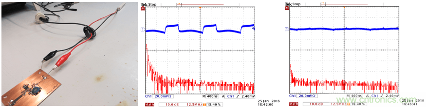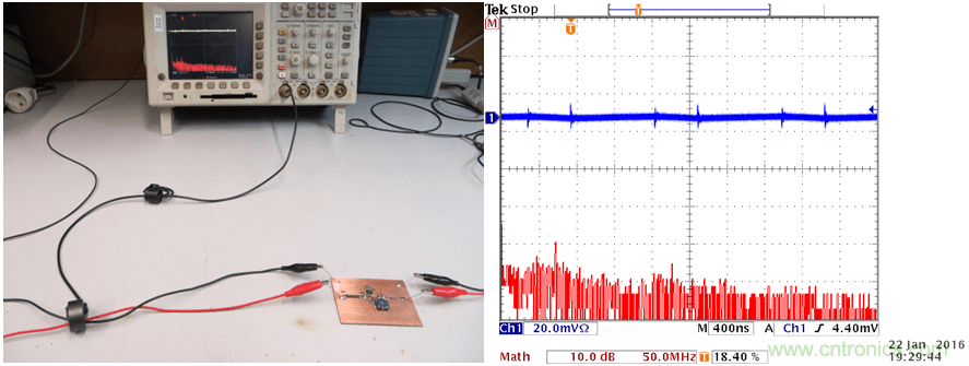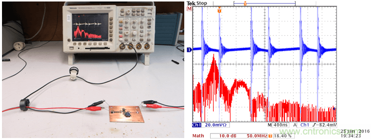 這種環形天線可以被連接到頻譜分析儀上,當你使它在PCB上方移動時,你就可以看到哪裏會有比較強的高頻磁場。你也可以把它連接到一台示波器上(使用50Ω的端子),示波器上就可以顯示出相應區域的切換噪聲水平。保持天線環和板子之間的相對位置和距離不變,對電路、PCB上的回路做出某些改變,你就可以知道噪聲水平在增加或是減少。