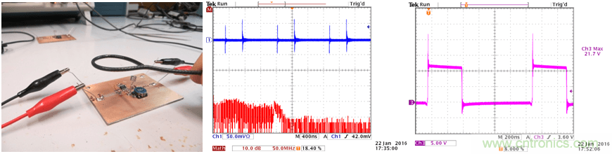 轉換器的電源輸入來自於三隻串聯的鋰離子電池,電壓大約為12V,這就使它們和實驗室裏的其他設備沒有了直接聯係。一隻電解電容跨接在電池的引線上,這可消除電池電感可能導致的諧振問題。