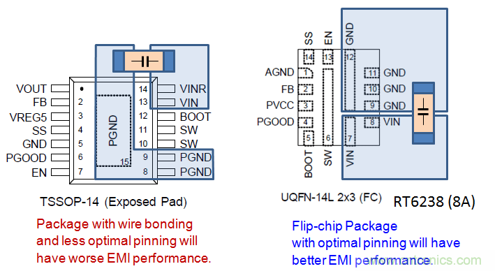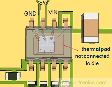 在RT7297CHZSP中,芯片底部的散熱焊盤是沒有和晶圓內核連接在一起的,所以在PCB布局中將銅箔和散熱焊盤連接在一起並不能縮短CIN回路。它的上橋MOSFET和下橋MOSFET通過多根邦定線連接到VIN和GND端子,因而可以通過這兩個端子形成最短的回路。