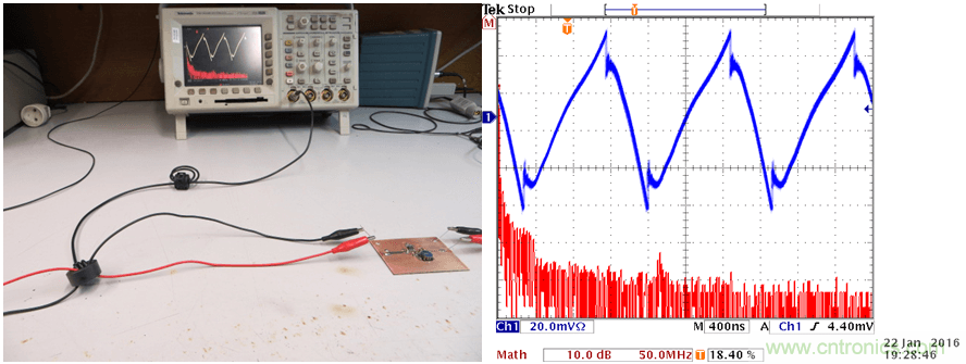 自製的EMI電流測試工具(見第8章)kebeianzhizaidianyuanshuruxianheshuchuxianshang。zaibenwenzhong,womenshiyongshiboqilaiguankanceliangdaodegaopindianliuxinhao,tanengxianshichuzhuanhuanqikaiguanqiehuanqijiandegaopinxiaoxinhao。duiyuzhezhongzhongfuchuxiandekaiguanqiehuanxinhaoeryan,shiyongshiboqideFFT功(gong)能(neng)進(jin)行(xing)計(ji)算(suan)並(bing)看(kan)到(dao)測(ce)量(liang)電(dian)流(liu)中(zhong)的(de)各(ge)種(zhong)頻(pin)率(lv)成(cheng)分(fen)是(shi)可(ke)能(neng)的(de)。這(zhe)種(zhong)方(fang)法(fa)雖(sui)然(ran)不(bu)如(ru)頻(pin)譜(pu)分(fen)析(xi)儀(yi)那(na)麼(me)精(jing)確(que),但(dan)仍(reng)然(ran)不(bu)失(shi)為(wei)一(yi)種(zhong)非(fei)常(chang)實(shi)用(yong)的(de)工(gong)具(ju),可(ke)在(zai)簡(jian)單(dan)電(dian)路(lu)的(de)分(fen)析(xi)中(zhong)提(ti)供(gong)判(pan)斷(duan)依(yi)據(ju)。