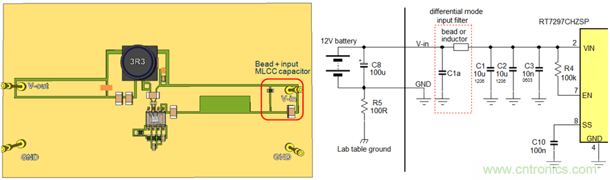 由於Buck轉換器輸入電流的不連續特性和實際為轉換器供電的電源線通常都很長的緣故,輸入回路A3所造成的輻射也可能是很可觀的,並且可導致超出規格的傳導輻射(在150kHz~30MHz頻段),不能通過電磁兼容(EMC)的傳導測試檢驗。