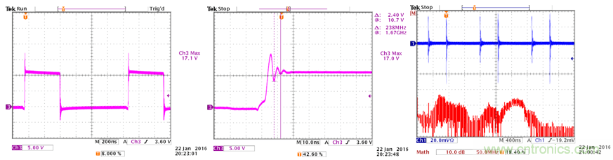 開關切換過程中的過衝和振鈴信號的幅度都降低了大約50%,輻射的強度下降了大約10dB,頻帶寬度擴展到了300MHz。