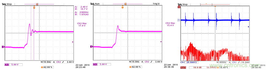 我們也同時看到開關切換波形上出現很高的過衝和振鈴信號,這些信號實際上已經超過了IC的耐壓規格。這些狀況說明錯誤的輸入電容放置位置可以導致很高的輻射和巨大的振鈴信號。