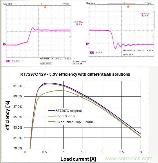 RC平滑抑製電路對效率的影響會比較大,特別是在輕載和中等負載的情況下,但最大也就1~2%,處於可以接受的範圍。需要特別注意的是,當Buck轉換器的工作頻率很高和輸入電壓很高的時候,RC平滑抑製電路對效率的影響會很大。