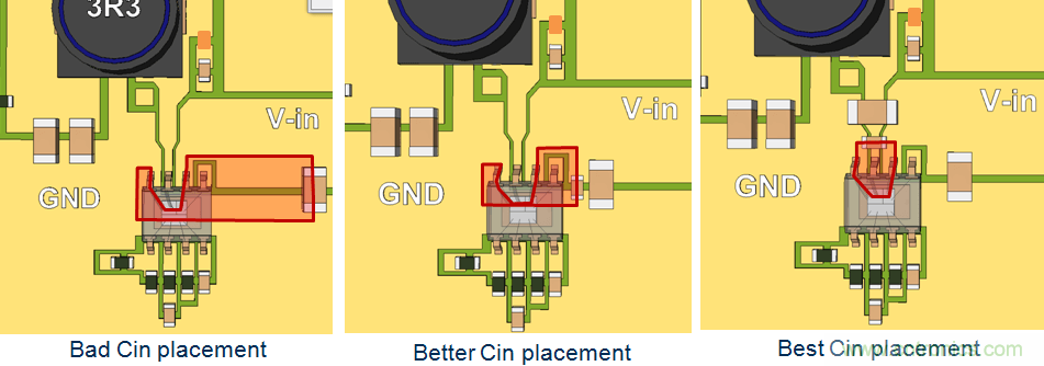 確定開關切換回路的VIN和GND節點位置,將不同尺寸的輸入電容盡可能靠近這些節點,最小的電容靠節點的位置要最近。由於這個切換回路承載了很高的電流變化率dI/dt,因而需要盡可能地小。