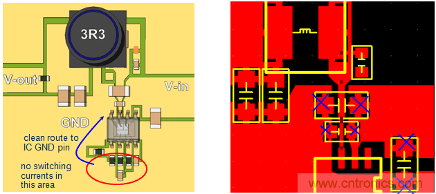 將輸出電容地放在不與輸入電容切換路徑發生重疊的地方,避免高頻噪聲串入輸出電壓中。