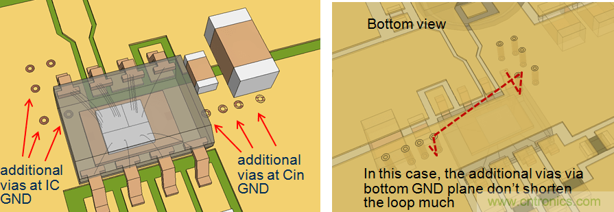 在上麵的例子中,通到地線層的附加導通孔對縮減CIN回路的長度沒有幫助。但在另一個例子中,由於頂層的路徑很長,通過導通孔來縮小回路麵積就十分有效。