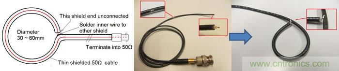 其實我們是有可能在實驗室環境下對產品原型進行一些基本的EMI測試的,還可對係統的各個模塊分別進行。這樣的測試通常屬於近場環境(測量距離 < 0.16λ),因而在測試電流回路的輻射狀況時需要使用小型的環形天線來對高頻磁場進行測量。你可以使用一段50Ω的同軸電纜自己製作小型的擁有電屏蔽的環形天線,這看起來並不是一件很難的事情,可參考圖43的示意進行。