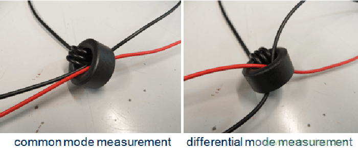 將電源線的正、負兩條線以同一個方向穿過鐵芯可測量其中的共模電流,顛倒其中一條線的方向則可測量差模電流。參見圖45。