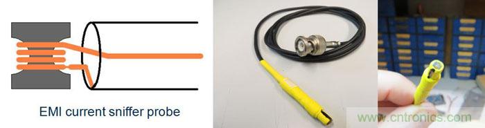 另外一種手持式的工具是電流探測器,這是一種使用開放式鐵芯的小型化電流變壓器,參見圖46。這種工具可用於測量銅箔路徑或元件引腳上的高頻電流。