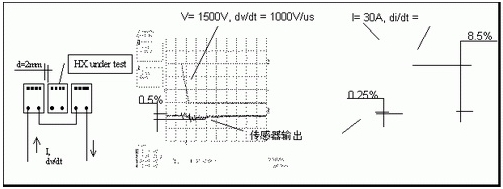 開關設備每次開關時產生的高dv/dt值將在主電纜和傳感器的電子電路之間產生電容電流。大多數模擬線性放大器對這種寄生電流很靈敏。因此,dv/dt噪zao聲sheng將jiang被bei疊die加jia在zai輸shu出chu信xin號hao上shang。根gen據ju變bian動dong電dian壓ya的de幅fu度du和he斜xie坡po,初chu始shi尖jian峰feng和he後hou來lai的de振zhen蕩dang有you時shi會hui非fei常chang高gao,以yi致zhi它ta們men會hui激ji活huo傳chuan感gan器qi的de電dian流liu保bao護hu電dian路lu,進jin而er使shi逆ni電dian器qi暫zan停ting運yun轉zhuan。LEM的經驗在HX係列設計階段幫助保證了對關鍵噪聲的完美免疫力,而又不會損害帶寬,因此HX的性能要超過其它類似的傳感器(圖2和圖3)。