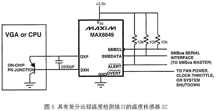 圖5為筆記本電腦普遍使用的一種溫度控製方案。溫度傳感器IC通過SMBus接口連接到筆記本電腦的嵌入式微控製器,由於溫度傳感器IC與嵌入式微控製器之間為數字接口,因此溫度傳感器IC在位置上可以遠離嵌入式微控製器而不會有噪聲幹擾問題。MAX6649同時內置一個本地溫度傳感器和用於連接遠端二極管的差分接口。MAX6649的IDH=100uA,IDL=10uA,高精度、小電流的電流源可減小因雜散電阻所產生的測量誤差。差分輸入有助於降低噪聲幹擾。圖5所示電路,溫度傳感器IC隻負責溫度檢測,風扇轉速控製由嵌入式微控製器完成,由軟件實現。為了避免軟件控製的死機問題,MAX6649還集成了保護功能,當溫度到達第一個高溫臨界點時,MAX6649 ALERT可發出中斷請求,要求嵌入式微控製器進行相應的處理,例如對處理器進行降頻;如果上述對策仍無法有效抑製溫度的上升,當溫度達到第二高溫臨界點時,MAX6649 OVERT可以用來控製係統的第二個風扇或對係統進行強製關機。圖5具有低成本、高精度、使用彈性大等優點,但在軟件的設計上需花費較多的功夫。