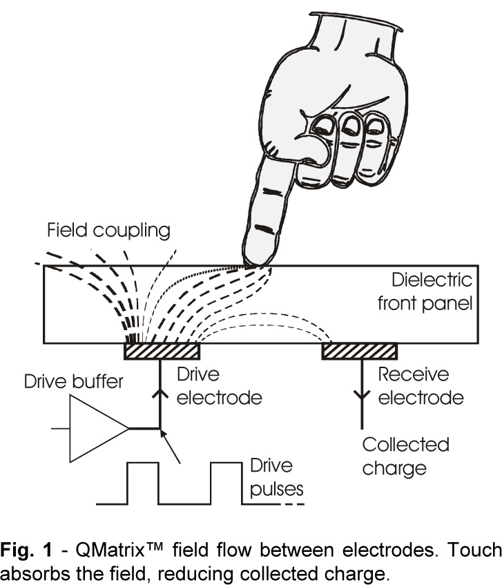 利用多條 X 驅動和 Y 接收線並將按鍵電極設置到交叉點上構成的多鍵矩陣,鍵盤按鍵會如機電鍵盤般按時順序掃描。QMatrix 電極可以感測任何介電材料,如厚度高達 50mm 的玻璃或塑料,取決於電極的大小和脈衝串長度 (增益) 的設置。
