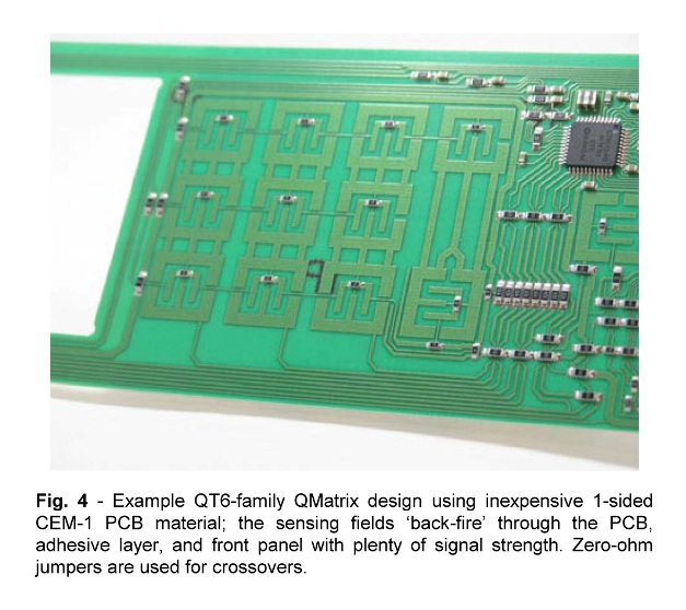 圖4:QT6 係列 QMatrix 設計示例。設計采用廉價的單麵 CEM-1 PCB 材料,感測電場背對穿過 PCB 、膠層和前麵板,其信號強度集中在前麵板方向上,使用0 歐姆的跳線器作為交叉。[page]