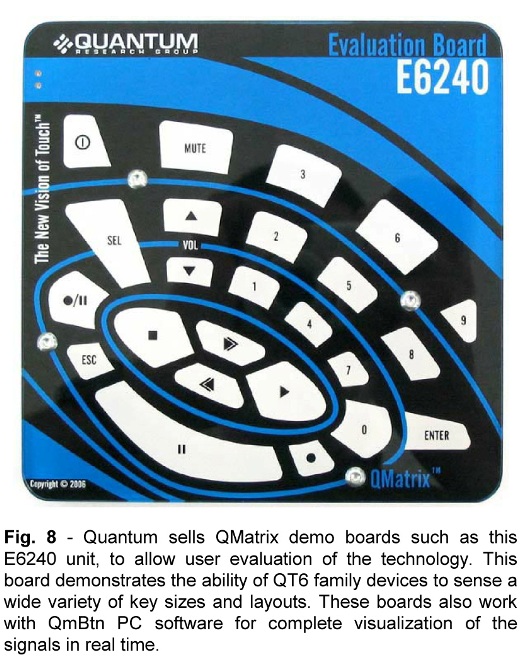 圖8 :量研科技銷售 QMatrix 演示版如 E6240,為用戶提供該技術的評測手段。該評測板可以支持各種按鍵尺寸和布局,演示 QT6 係列器件的強大功能。QMatrix 演示版還可配合 QmBtn 軟件使用,以進行按鍵實時信號的全景視象化觀測。