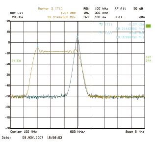 另一種可行解決方案是使用展頻振蕩器(Spread Spectrum Oscillator),來降低係統輻射出來的EMI電磁輻射幹擾。圖4則顯示一個單頻信號的頻譜圖以及對該信號展頻後的頻譜圖。從圖中可知展頻後的頻率信號如何降低原來在接近100MHz的峰值。