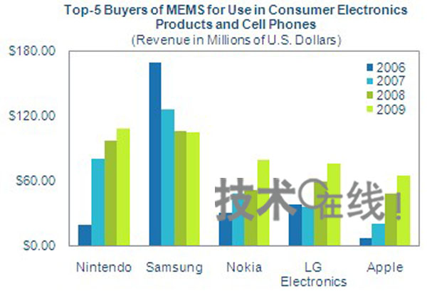 美國iSuppli透露,2009年消費類電子產品與手機MEMS部件的最大買家是任天堂。任天堂在提高遊戲機“Wii”遙控器動作識別精度的附件“Wii MotionPlus”中采用了陀螺儀(角速度傳感器),使得MEMS購買額比上年增加11.9%,達到1億800萬美元。超越了此前兩年內一直穩居榜首的韓國三星電子。緊隨其後的是名列第三的芬蘭諾基亞、位居第四的韓國LG電子以及位列第五的美國蘋果公司。