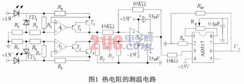 熱電阻的測溫電路如圖1所示,該電路由毫安級恒流源產生電路、差分運算電路和AD517芯片組成。該電路采用兩個完全相同的毫安級恒流源分別給熱電阻RT和標準參考電阻Rf供電。在恒流源電路中,VD1和VD2為帶溫度補償的穩壓二極管,四個PNP型的三極管T1、T2、T3和T4組成了兩個PNP型複合管,其目的是為了提高放大器的增益,減小誤差,以便提高恒流源的穩定度。恒流源與RT和Rf(Rf取為Rf=100Ω)與yu地di組zu成cheng的de電dian路lu產chan生sheng的de電dian壓ya作zuo為wei差cha分fen運yun算suan電dian路lu的de輸shu入ru信xin號hao,根gen據ju電dian路lu的de組zu成cheng,可ke以yi得de到dao差cha分fen運yun算suan電dian路lu的de輸shu出chu電dian壓ya是shi與yu熱re電dian阻zu的de阻zu值zhi成cheng正zheng比bi的de,通tong過guo選xuan擇ze合he適shi的de元yuan器qi件jian參can數shu把ba該gai裝zhuang置zhi的de測ce溫wen範fan圍wei設she置zhi為wei0~120℃。