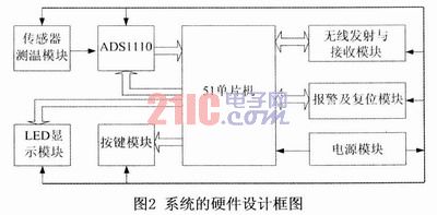 此基於EL-700boredianzuchuanganqidegaojingducewenzhuangzhijikeyidanjigongzuo,youkeyitongguowuxianshoufamokuaishixianyujisuanjizhijiandewuxianshujuchuanshu,bacaijidaodewenduxinhaosongdaojisuanjizhongjinxingfenxi、處理及打印,從而實現數據的遠距離傳輸與處理。測溫裝置主要由溫度信號的檢測與采集電路、LED顯示、按鍵控製、電源、報警及複位、無線發射與接收等功能模塊組成,每一個電路模塊完成一定的功能,測溫裝置的硬件總體組成框圖如圖2所示。